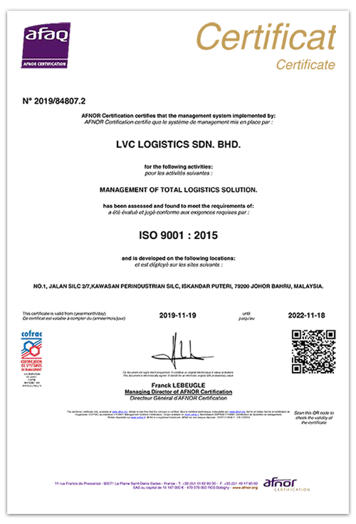We are proud to announce that LVC Logistics Sdn Bhd has achieved ISO 9001:2015 Certification through Afnor Certification body from France where they are accredited by COFRAC. This achievement is an important milestone for LVC as we continue to seek improvements on our Quality Management System.